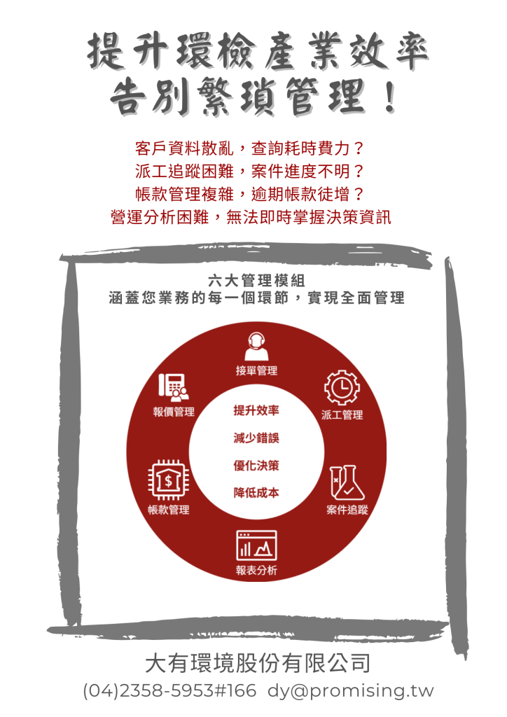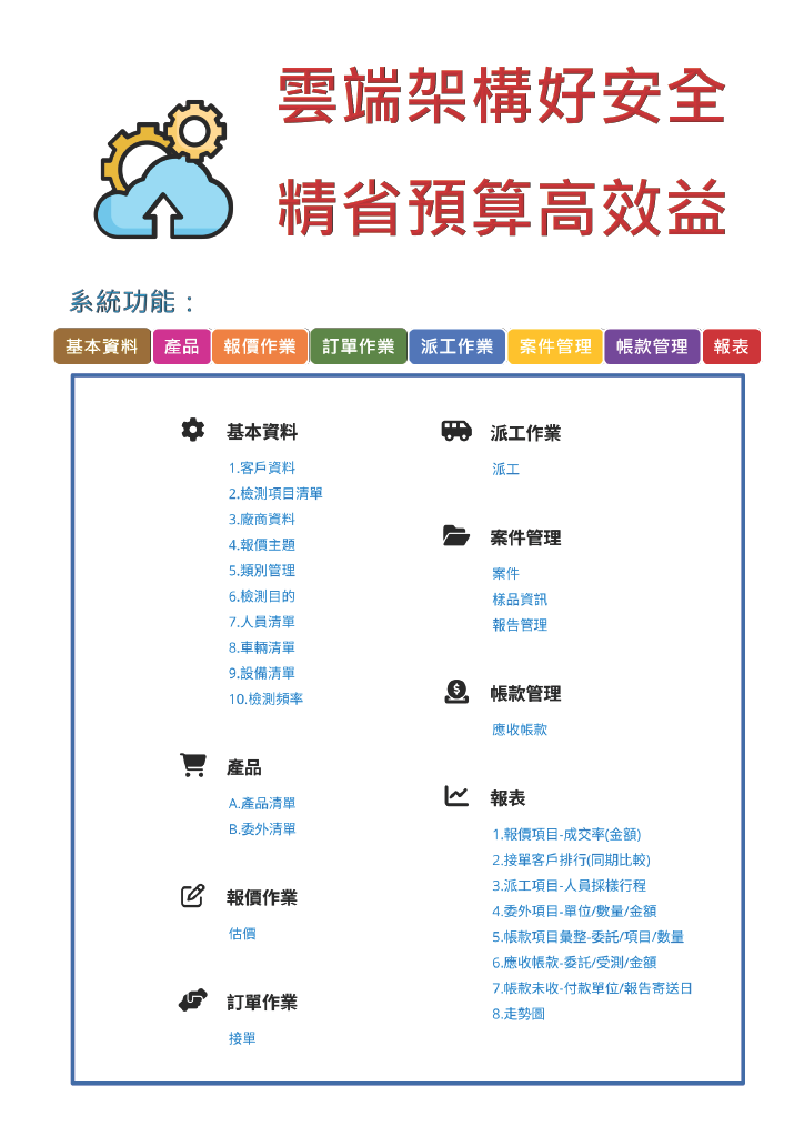 為環境檢測公司/實驗室的營運,提供報價、訂單、派工、客戶、帳款 …. 等管理系統